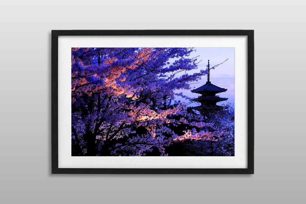 "Light-Up" is a high quality photo artwork by Inspirits Fine Art Photography. It captures the short and precious moment of twilight in the historic district of Gion, Kyoto, when the afterglow of sunset bathes the beautiful Pagoda in a purple glow, during the equally short and precious time of the full bloom cherry blossom, or sakura. The blossoms are breathtakingly lit in colors uniquely matching the twilight in a ceremony known throughout Japan as "Light Up". With this artwork, you allow your family and visitors of your home to witness a private cherry blossom viewing session (or hanami), not just the short time of sakura, but 365 days a year!